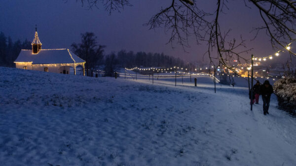 Die Weihnachtskarte 2024 der Inländischen Mission zeigt den Lichterweg in der Gemeinde Baar (ZG) mit der Kapelle Heiligkreuz in einer besonderen Abendstimmung. - Jetzt im IM-Shop bestellen.