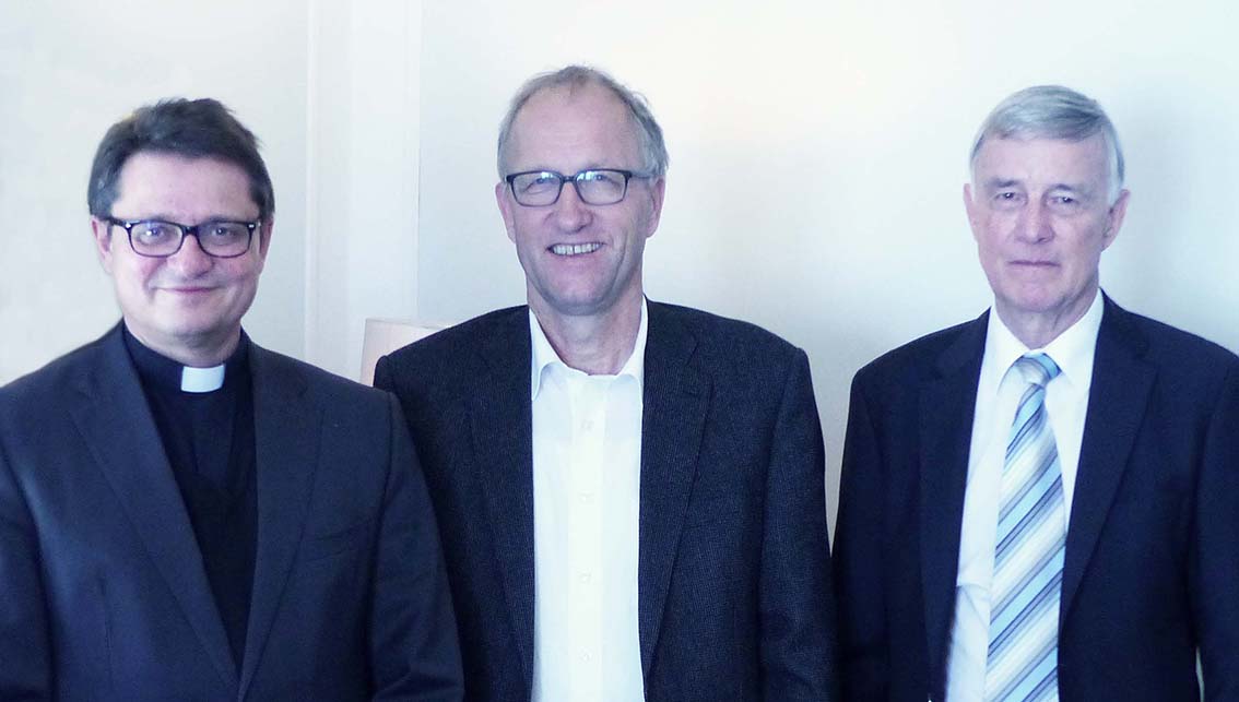 Bischof Felix Gmür, Ressortverantwortlicher für die Hilfswerke in der Schweizer Bischofskonferenz, der neue IM-Präsident Peter Hegglin sowie der abtretende IM-Präsident Paul Niederberger (v.l.n.r.). (Foto: ufw)