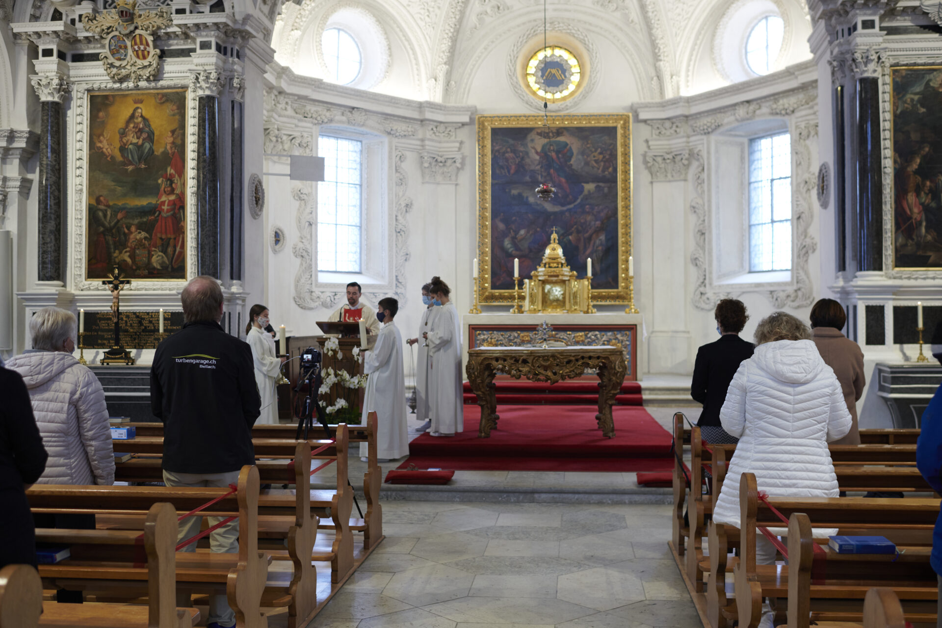 Der erste Gottesdienst unter Corona-Bedingungen in der innen restaurierten Pfarr- und Wallfahrtskirche Oberdorf (SO). (Foto: José R. Martinez)