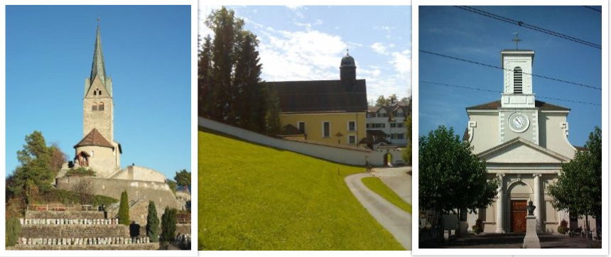 Die Kirche Sogn Gion in Domat/Ems (GR), das Kloster Wonnenstein in Niederteufen (AI) und die Pfarrkirche Heiligkreuz in Carouge (GE) profitieren von der Epiphaniekollekte 2019. (Fotos: zVg)