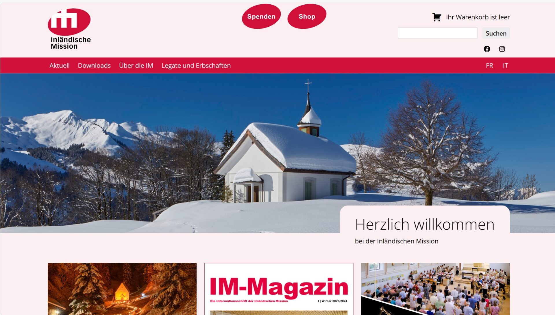 Neu finden Sie im oberen Bereich einen direkten Zugang zum IM-Webshop sowie zu Spendenmöglichkeiten. Dank Ihrer Unterstützung ist es der Inländischen Mission möglich, regelmässig finanzielle Beiträge an Pfarreien und Kirchgemeinden zu leisten, die dringend notwendige Sanierungen und Erneuerungen von Kirchenbauten nicht aus eigener Kraft finanzieren können. Dazu unterstützen wir in enger Zusammenarbeit mit den Schweizer Bischöfen auch ausgewählte Seelsorgeprojekte, damit Glaubensfragen zeitgemäss vermittelt werden können.