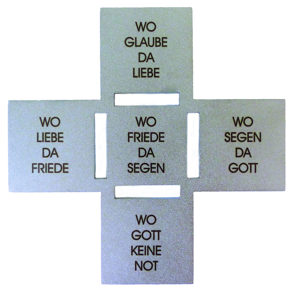 Das Haussegenskreuz aus Edelstahl, Oberfläche elektrolytveredelt, mit schriftgelasertem Satz «Wo Glaube da Liebe / Wo Liebe da Friede / Wo Friede da Segen /Wo Segen da Gott / Wo Gott da keine Not».